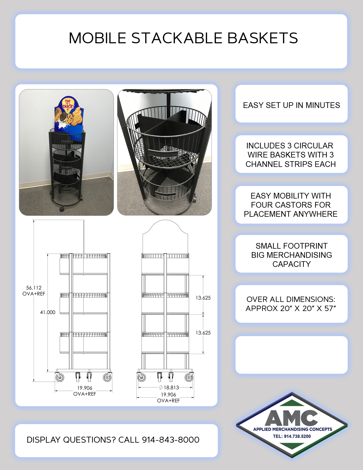 This small yet versatile display is great for any store! With only an 18″ x 18″ footprint and a body diameter of only 16″, it fits anywhere and can be rolled to any desired location on its lockable casters. Some of the features are: